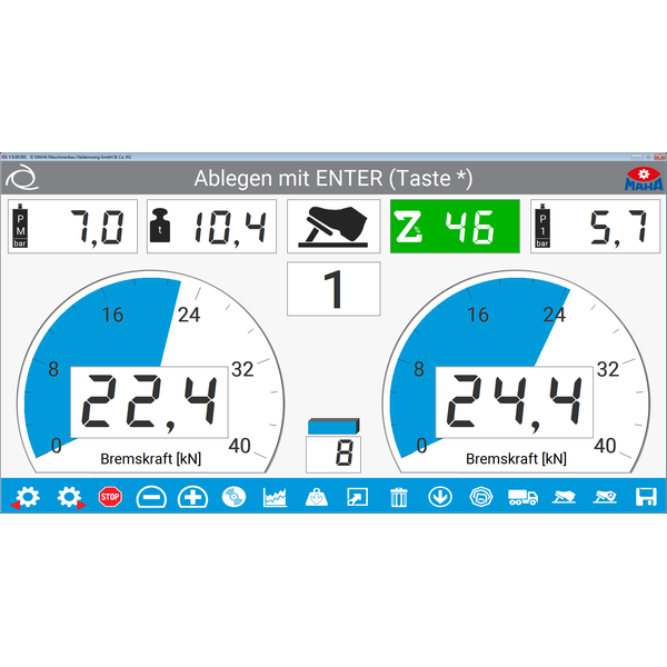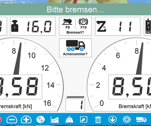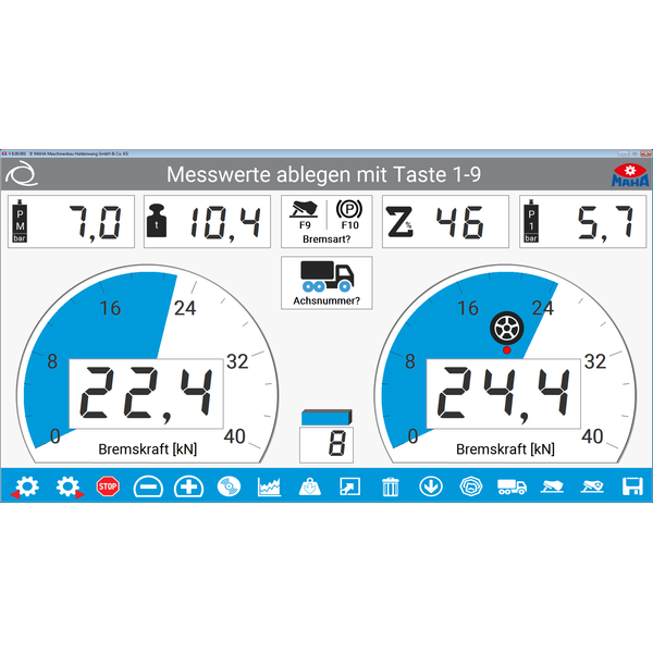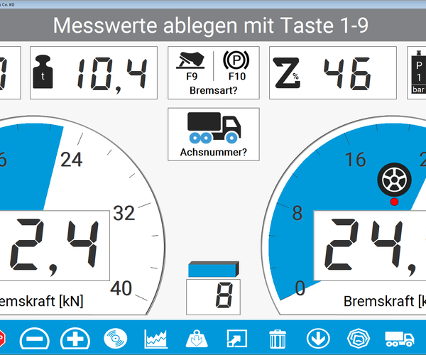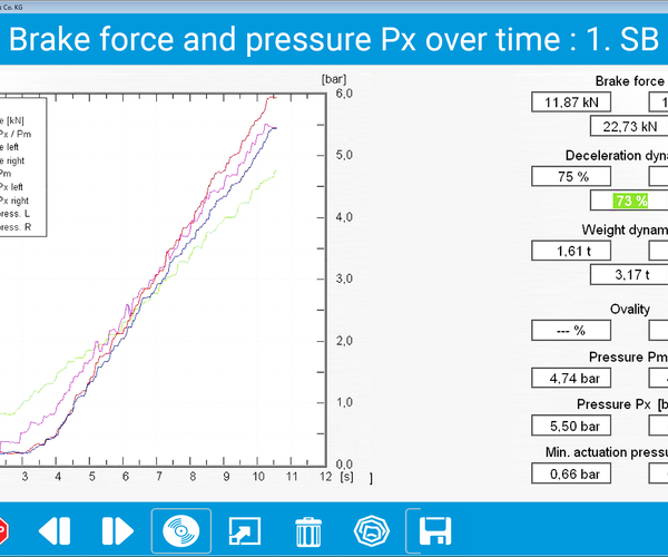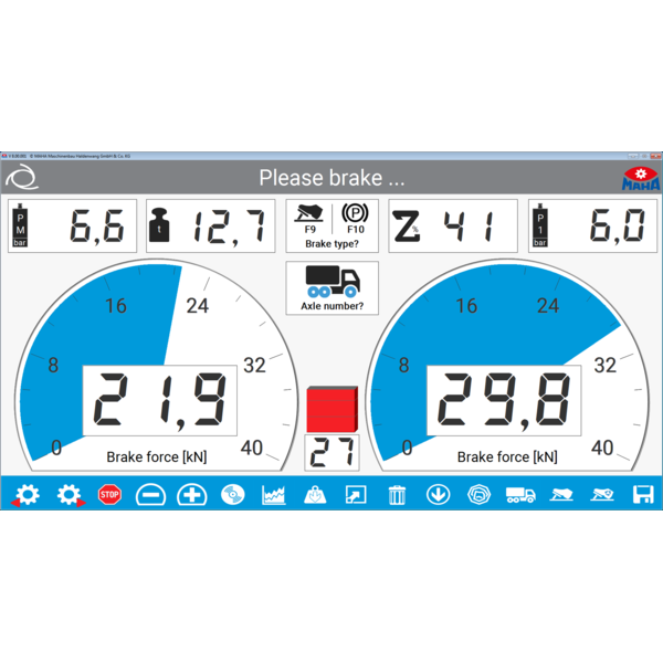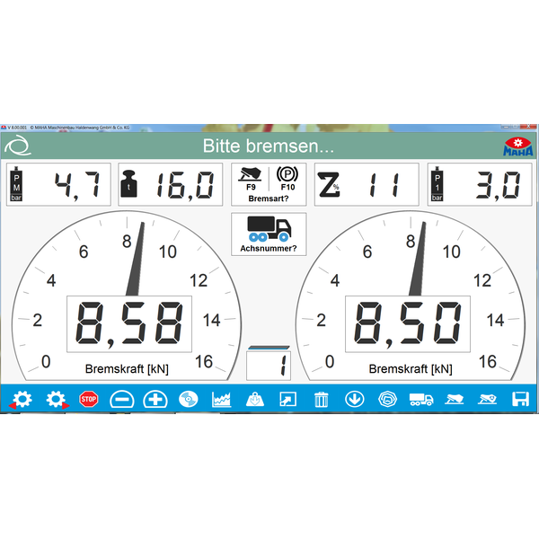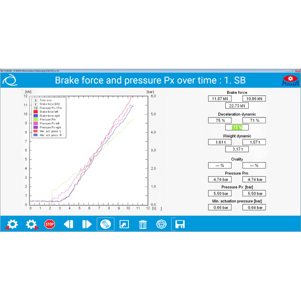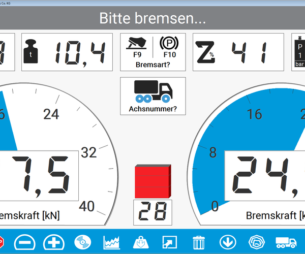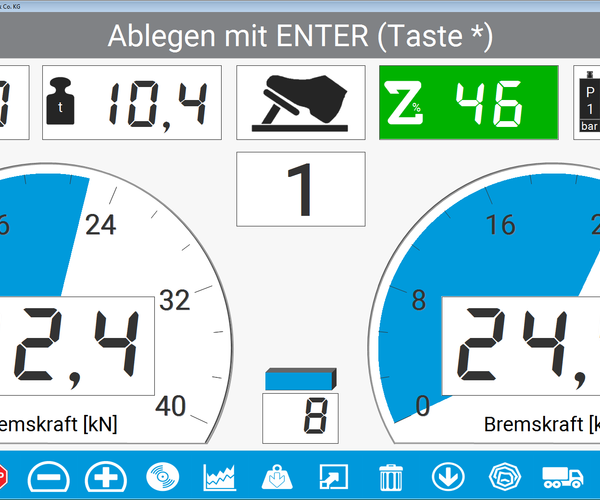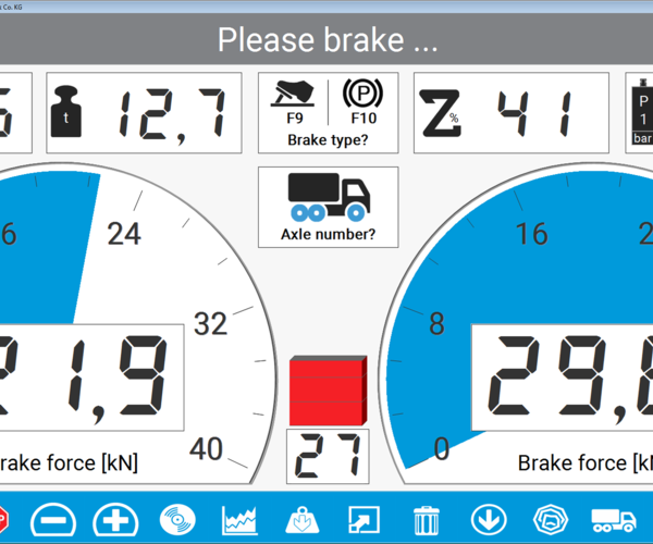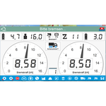 - Round instrument display for the braking forces Additional displays for difference, decelerations, and optional scale and force sensors.