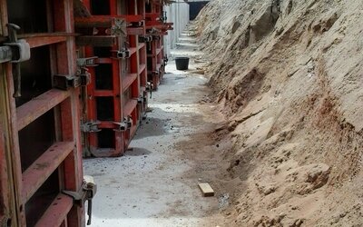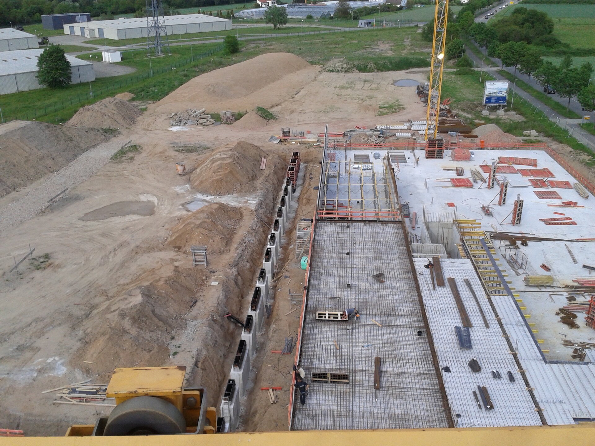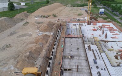 A geometer was then used to align them with millimetre precision, before the quivers were concreted one step at a time. In total, 26 installation boxes were precisely positioned and brought to the correct height in this way. Once the quivers had been pulled out, the foundations could finally be filled with sand and the workshop area was built around the installation boxes.
